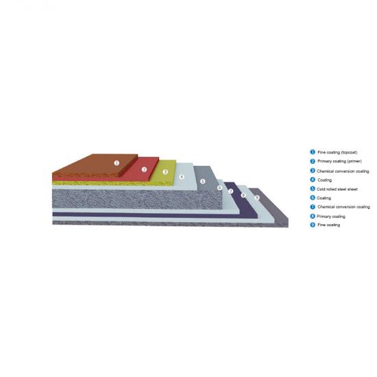 Revestimento fino (acabamento) + Revestimento primário (primer) + Revestimento + Chapa de aço laminada a frio