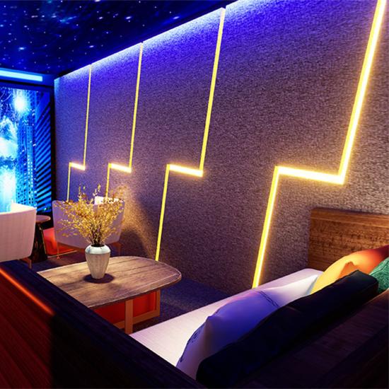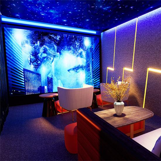 Esta pequena casa luxuosa conta com um projetor de alta definição integrado e painéis acústicos de parede, proporcionando uma experiência audiovisual imersiva com qualidade de cinema em um espaço compacto e privativo.